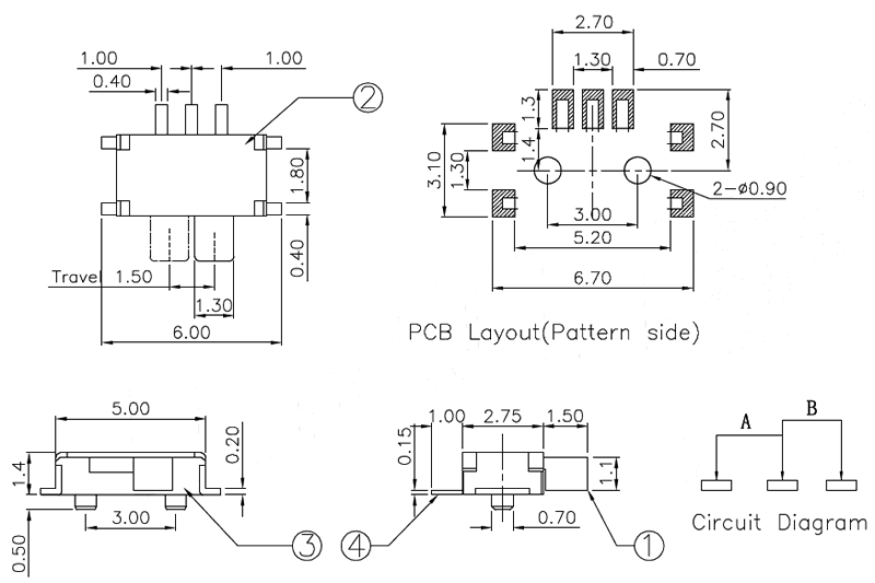 微型撥動開關(guān)技術(shù)參數(shù):